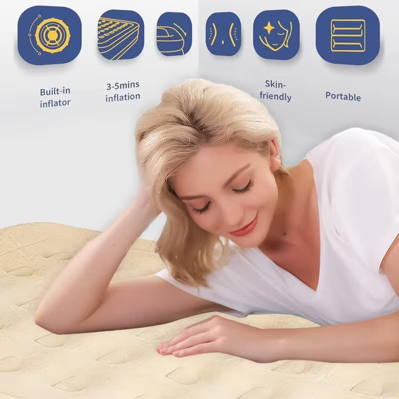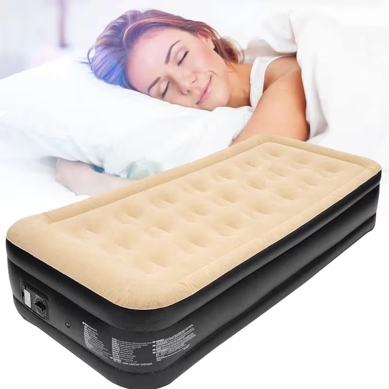 This quick-inflating double air mattress features a built-in 240V electric air pump (3-pin plug), allowing fast and hassle-free inflation and deflation. The high-raised design provides enhanced comfort and easy access, while the double-layer base ensures excellent support throughout the night.